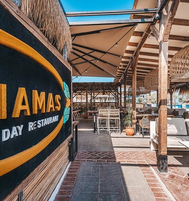 Indulge in high-end cocktails and savor high-quality cuisine made with fresh ingredients at Rumba Tiki Bar & Yiamas Restaurant, nestled in front of Marmari Beach.