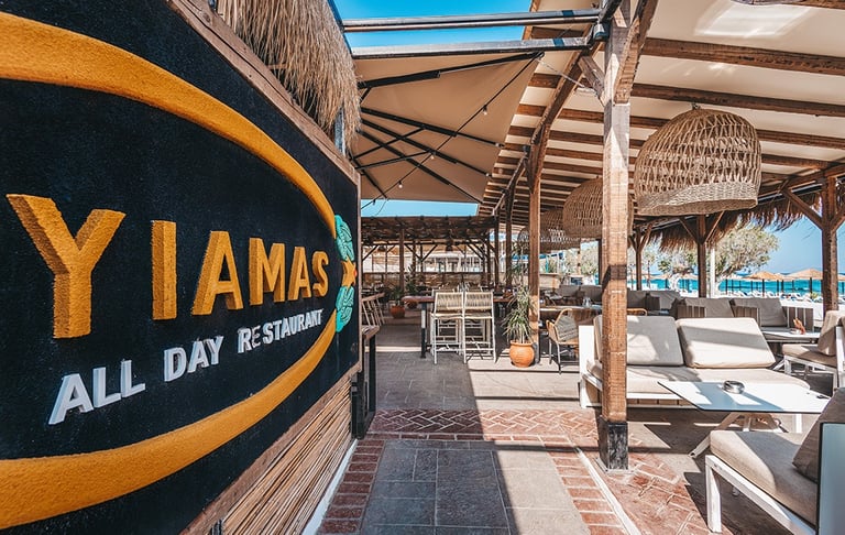 Nestled in front of Marmari Beach, Rumba Tiki Bar & Yiamas Restaurant offers an idyllic all-day beachside experience with high-end cocktails and high-quality cuisine.